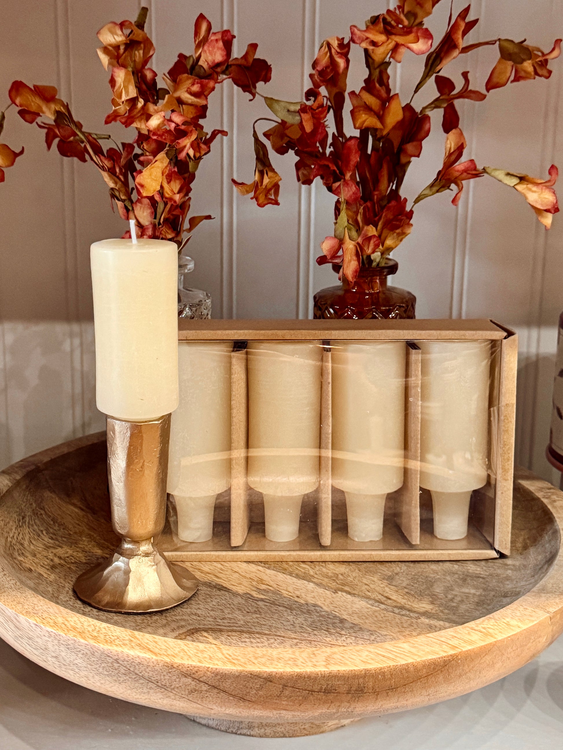 This boxed set of 4 unscented bottle taper candles brings a warm, elegant glow to any setting. With an approximate 9-hour burn time, they’re perfect for dinner tables, special events, or everyday ambiance. A timeless essential for any home.
