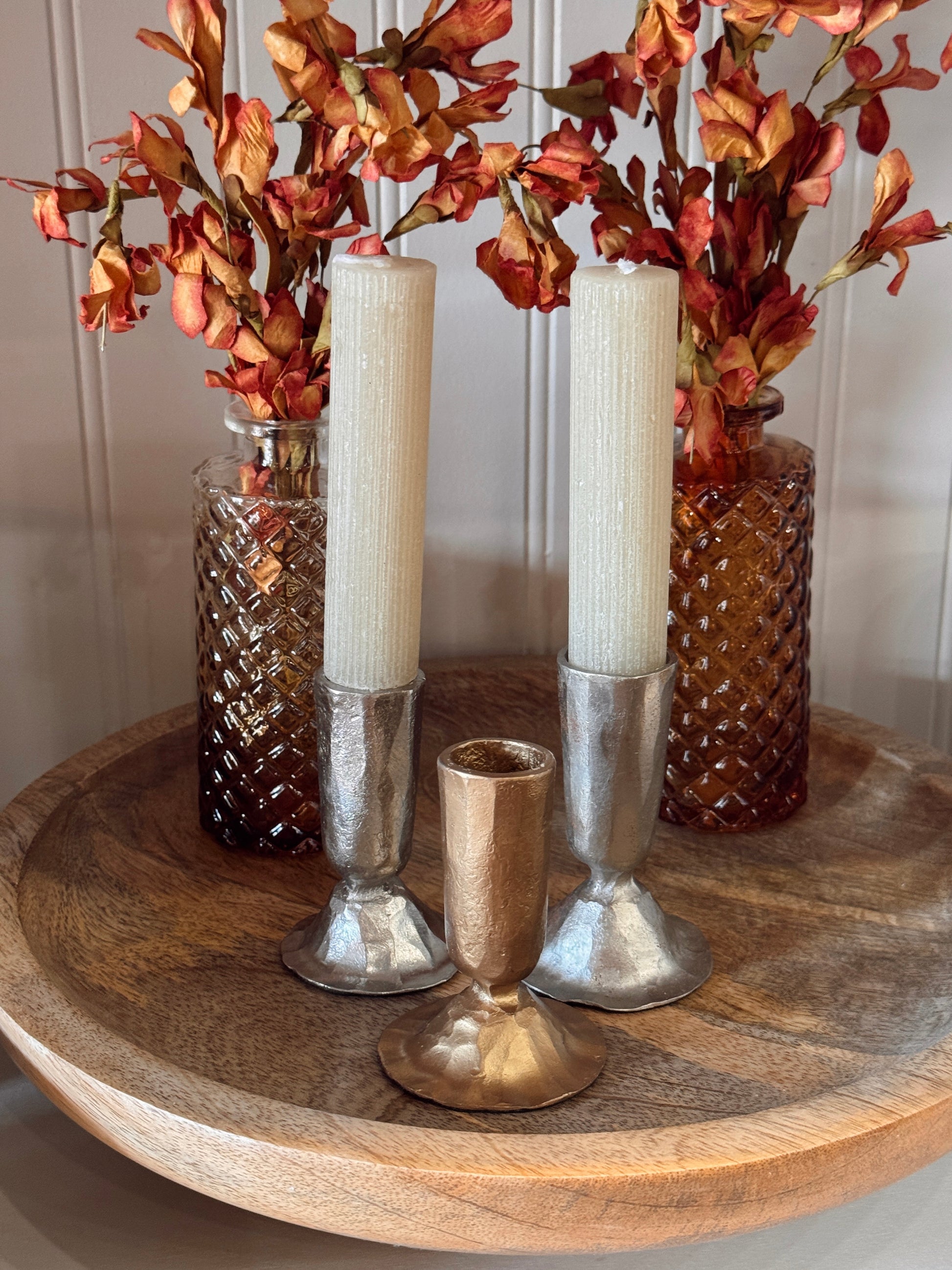 Small in size, big on style. These 1.75" round x 3.25" tall hand-forged taper holders come in two stunning finishes—perfect for mixing metals with ease. Designed to add contrast and character while blending beautifully into any setting.