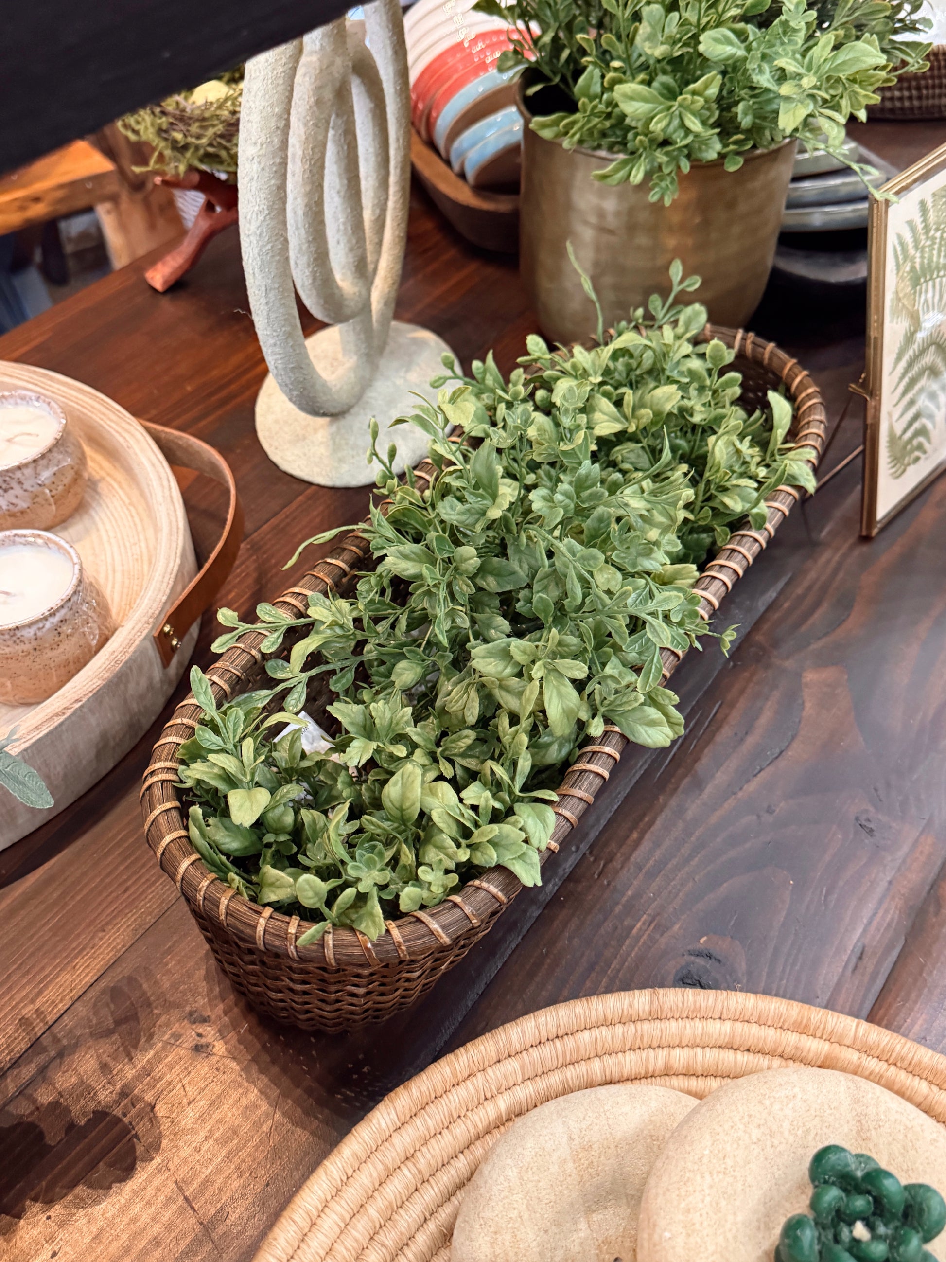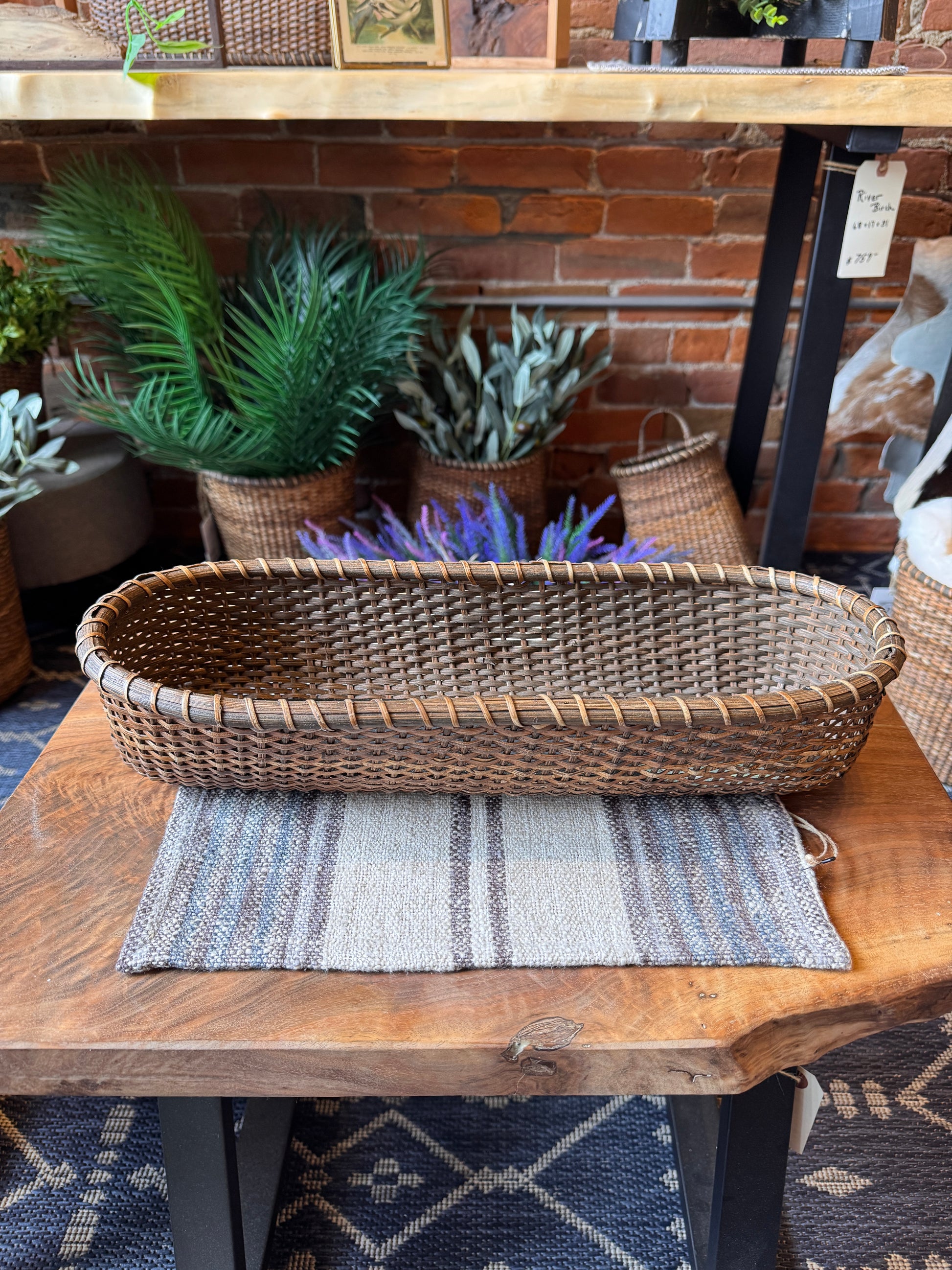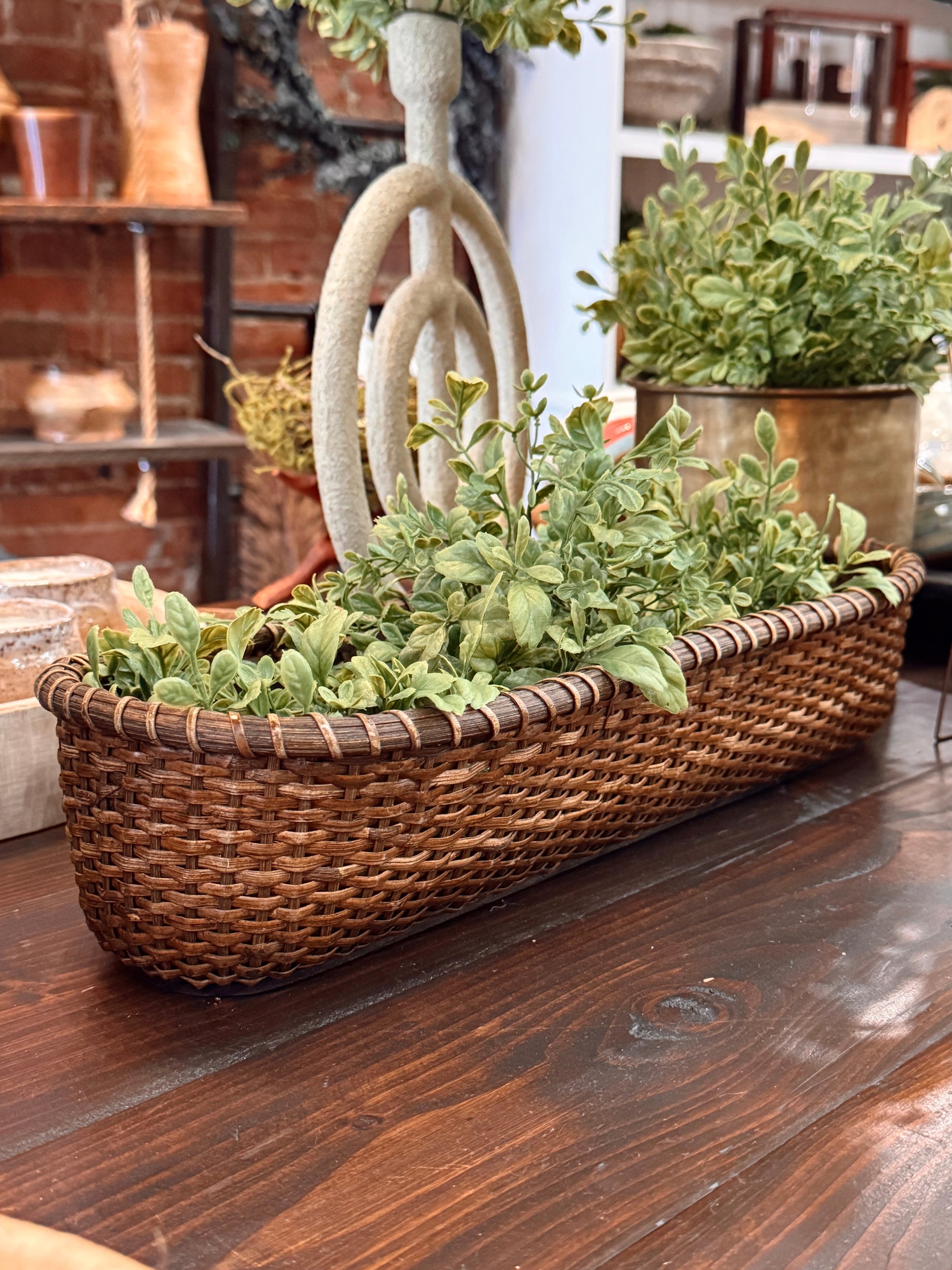 This handwoven rattan basket makes a beautiful and functional centerpiece. Measuring 16.25" x 6.25" x 3.5", it’s perfect for styling with seasonal decor, holding fruit on the counter, or adding texture to a coffee or dining table. Natural, versatile, and full of warmth—it’s an easy way to elevate any space.