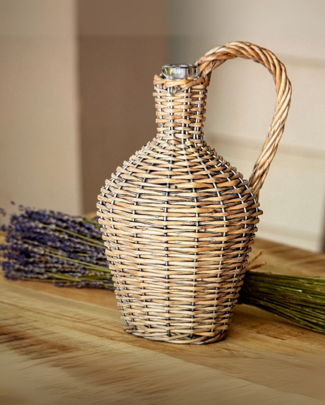 This glass bottle wrapped in natural rattan brings effortless texture and charm to any space. The built-in handle adds a touch of rustic character, while the clear bottle interior makes it perfect as a vase for fresh stems, dried florals, or simple greenery. A beautiful blend of form and function for shelf styling or tabletop centerpieces.