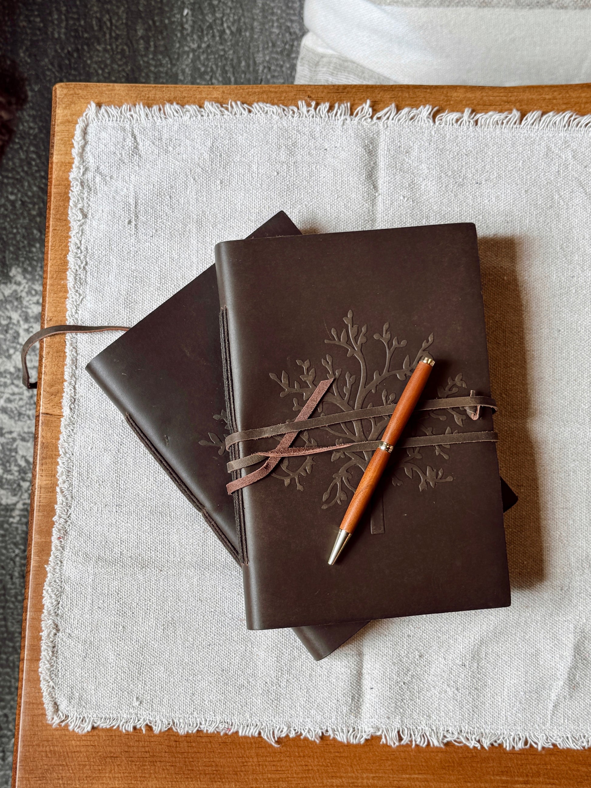Leather Bound Journal with Handmade Paper, Embossed Tree and Tie