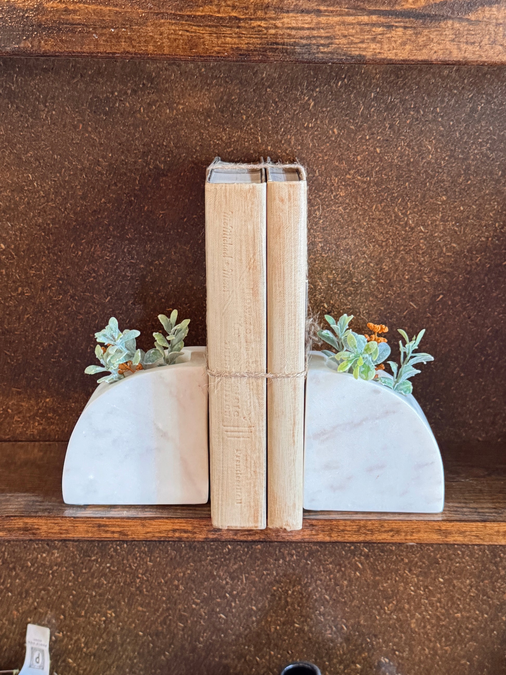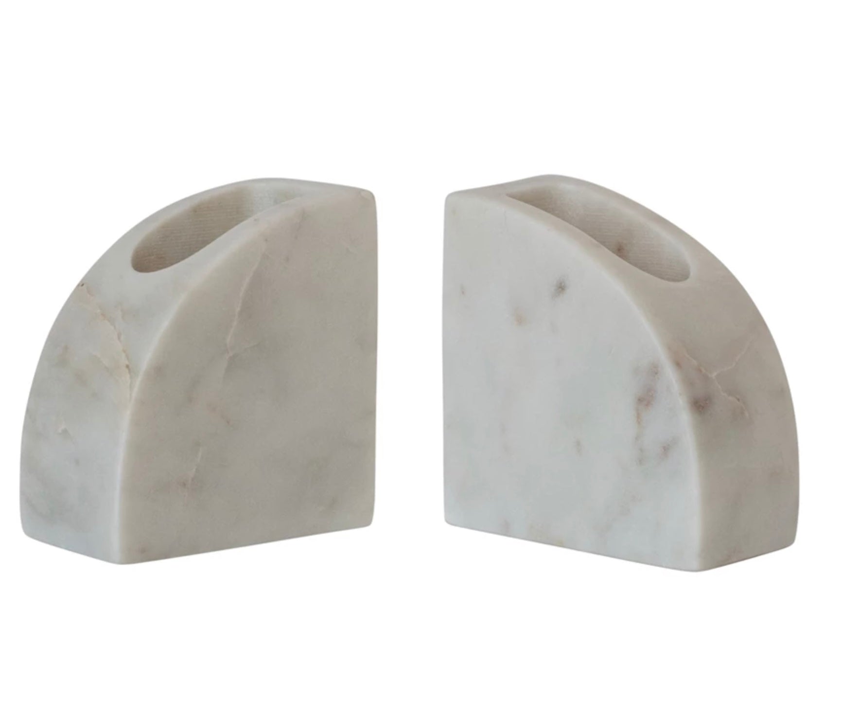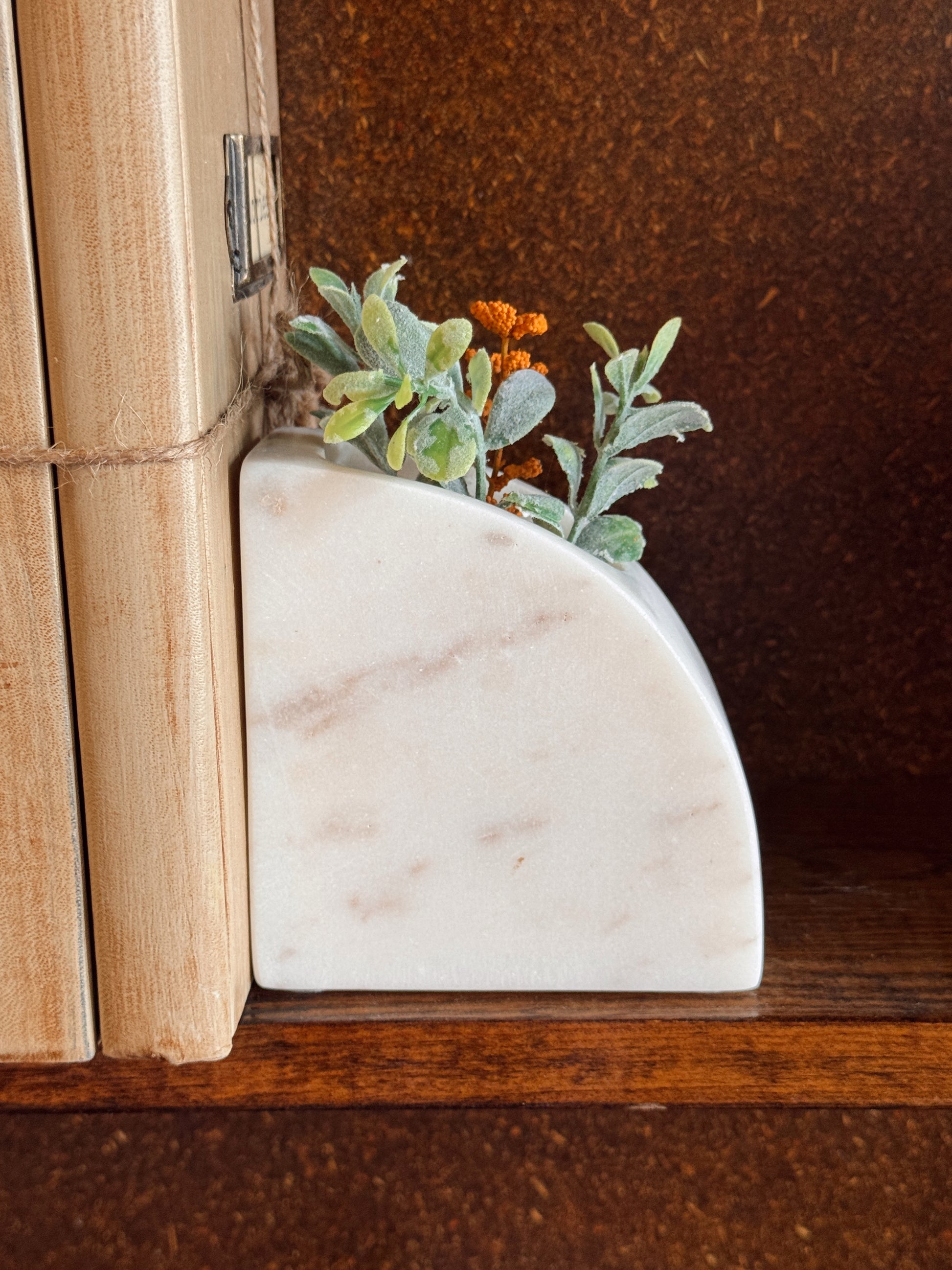 Timeless and functional, this set of white marble bookends doubles as small vases or containers. Each piece measures 4" x 2" x 4" and brings a clean, sculptural touch to shelves, desks, or built-ins. Use them to hold your favorite reads, fresh or dried stems, or small essentials—all while adding understated elegance to your space.