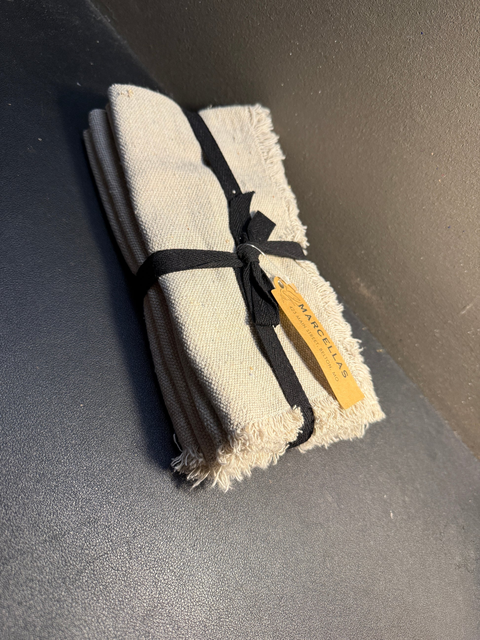 This is a set of four 18 x 18" heavy cotton napkins, made from new dropcloth. They are hand cut, edge sewn and fringed, so they will get softer and the fringe fibers will meld together in the wash. These are comfortable, absorband yet durable. The color is neutral to add a layer of texture, but remain completely versatile. Cloth napkins although eco-friendly, elevate every occasion making it feel special.