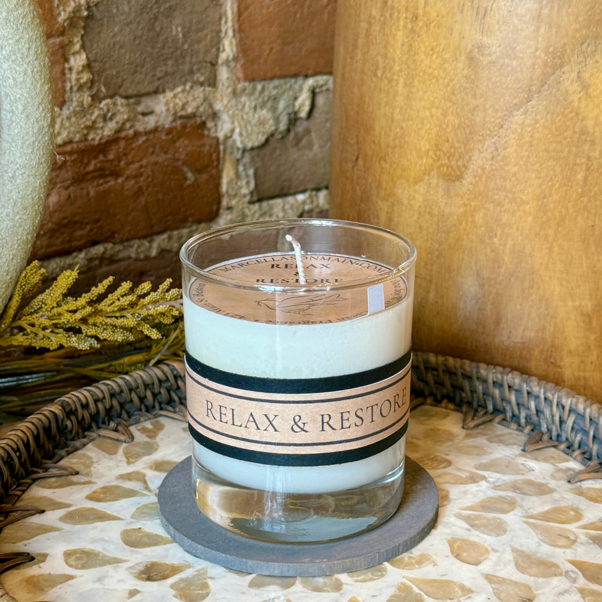 Housed in a timeless clear glass container, every candle comes with a simple wooden coaster for safe burning and a smokeless snuffer to make extinguishing effortless.