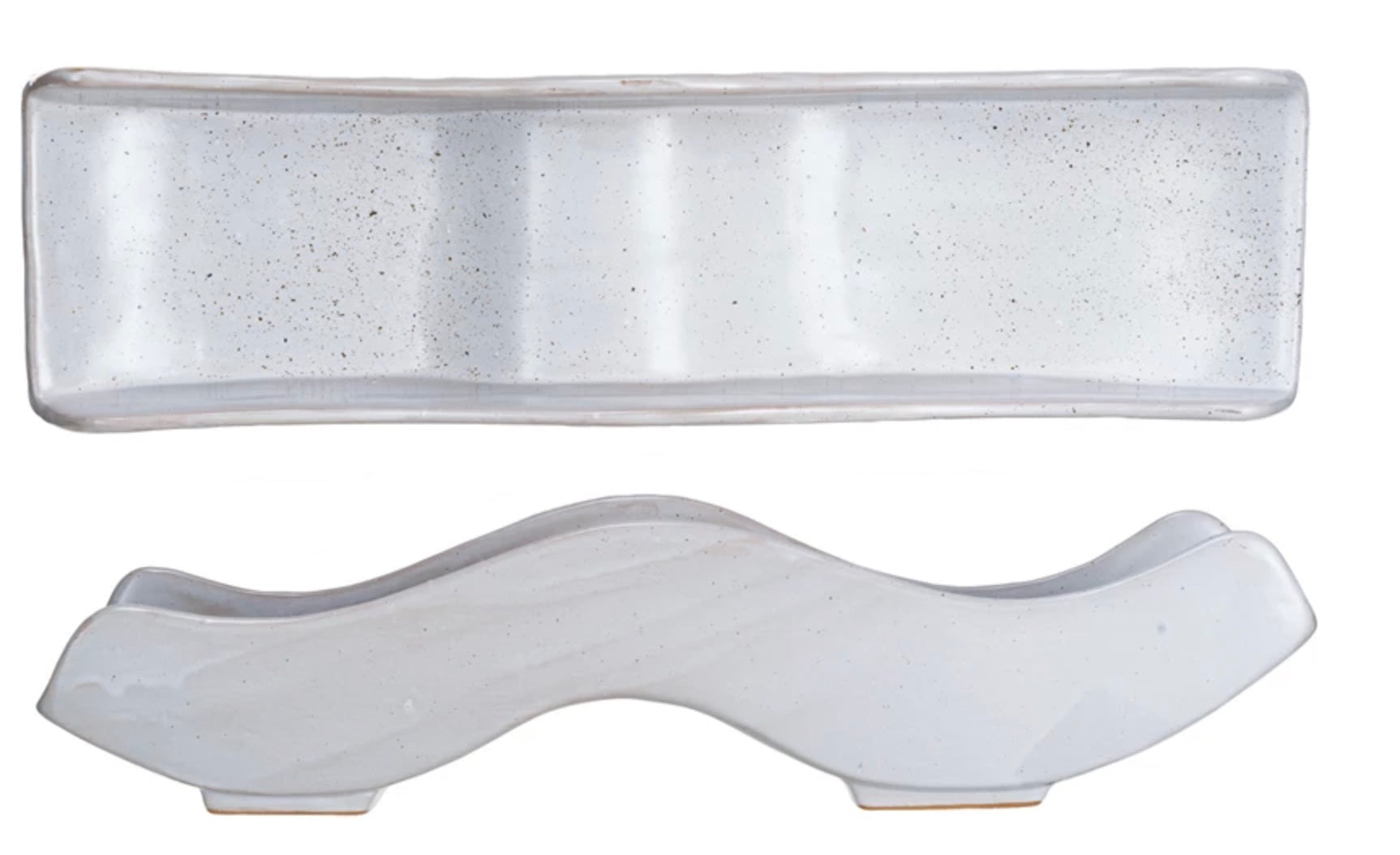 This white stoneware tray features a unique wavy shape and a beautiful reactive glaze, giving each piece its own one-of-a-kind finish. Durable and versatile, it’s perfect for serving snacks, appetizers, or desserts. The sleek design pairs effortlessly with any style—from farmhouse to coastal to modern. A standout piece for everyday use or entertaining.